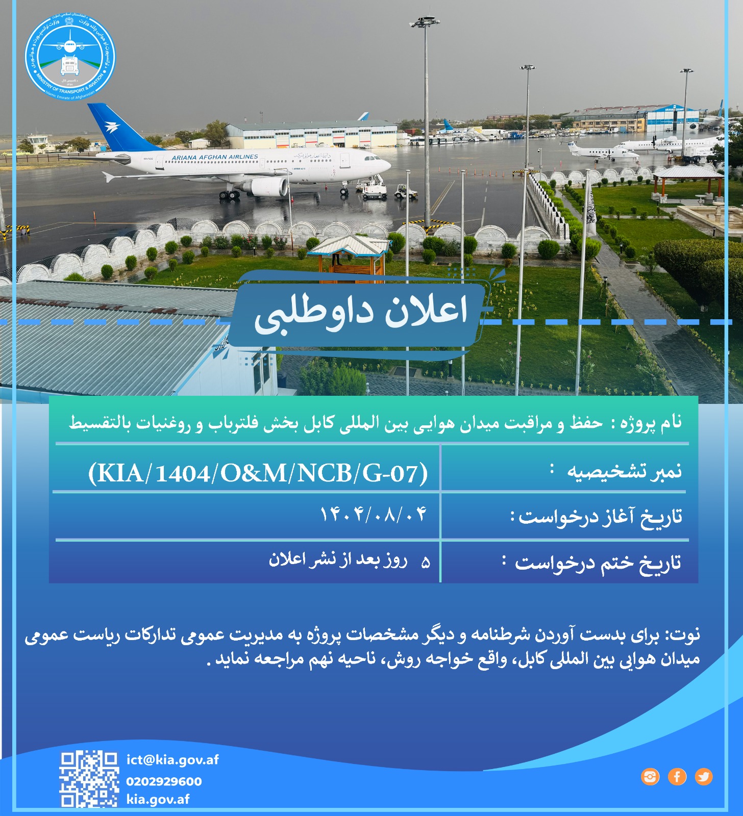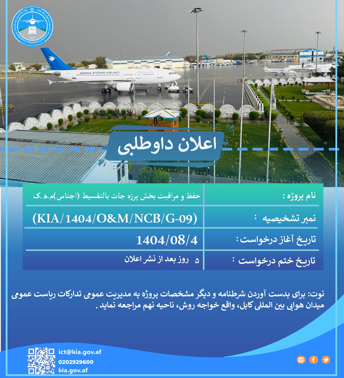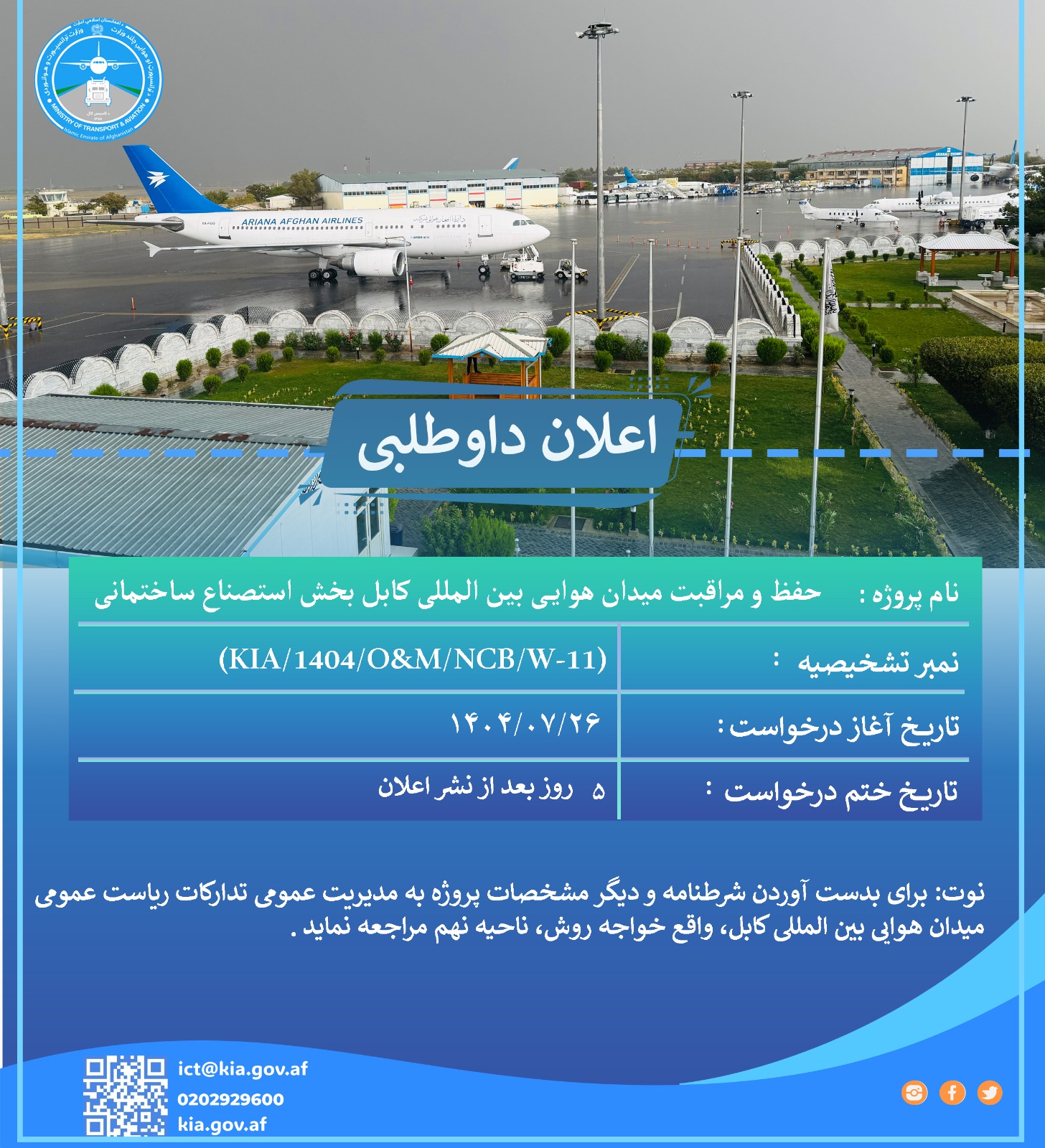 ریاست عمومی میدان هوایی بین المللی کابل از تمام داوطلبان واجد شرایط دعوت می نماید تا در پروسه داوطلب...