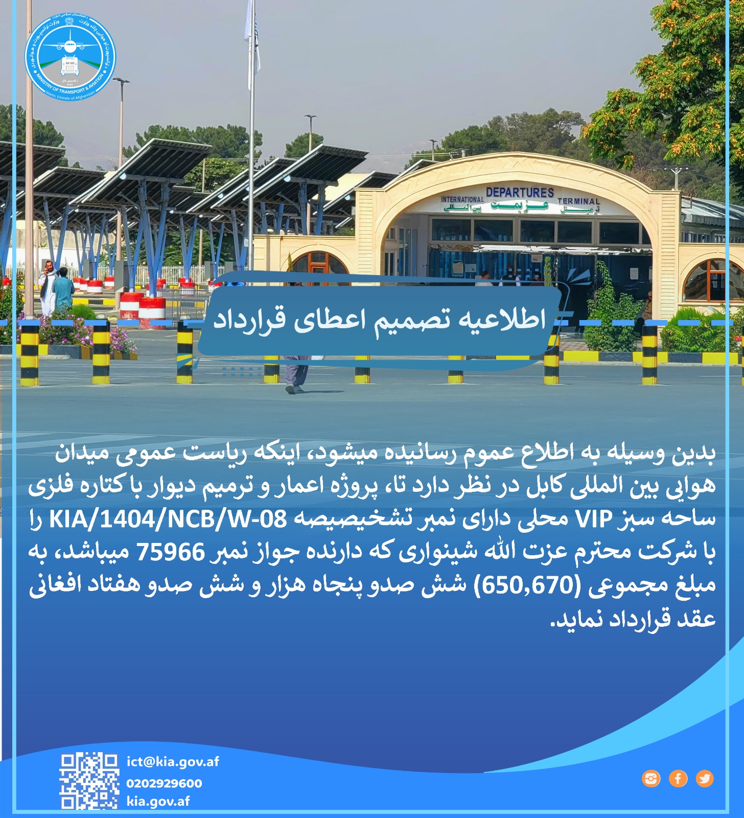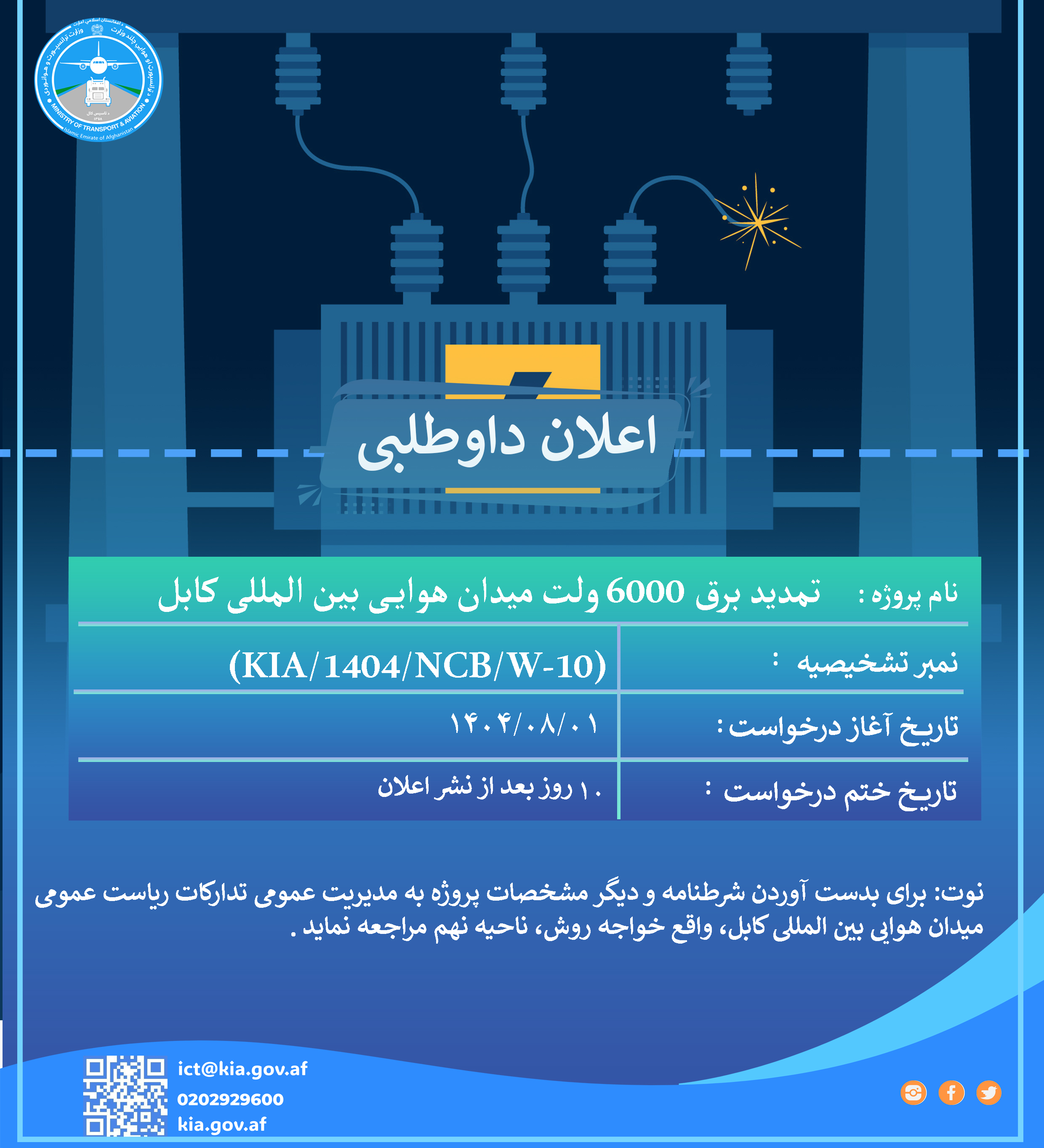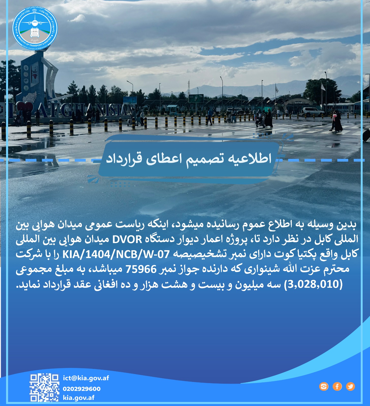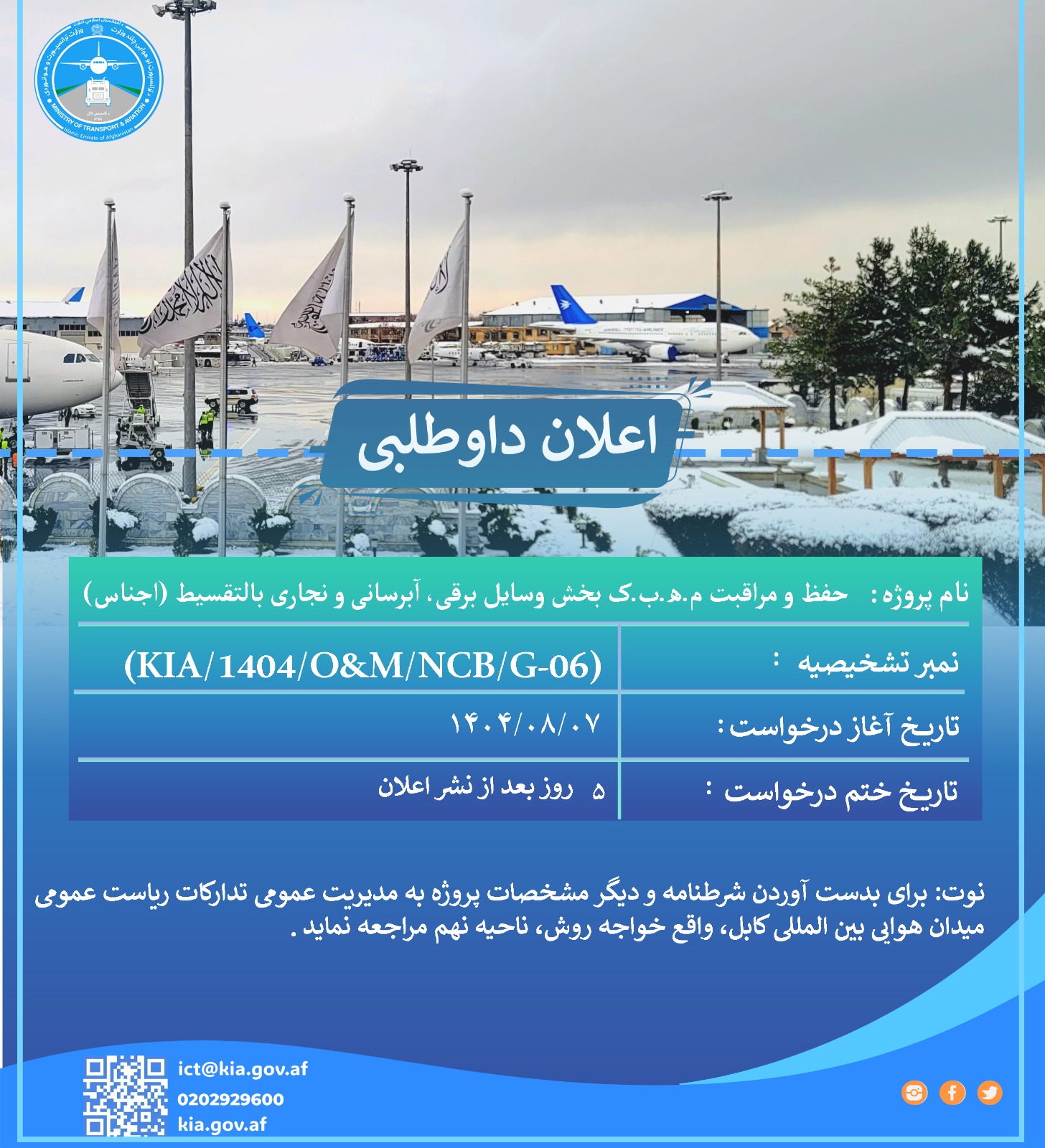 ریاست عمومی میدان هوایی بین المللی کابل از تمام داوطلبان واجد شرایط دعوت می نماید تا در پروسه داوطلب...