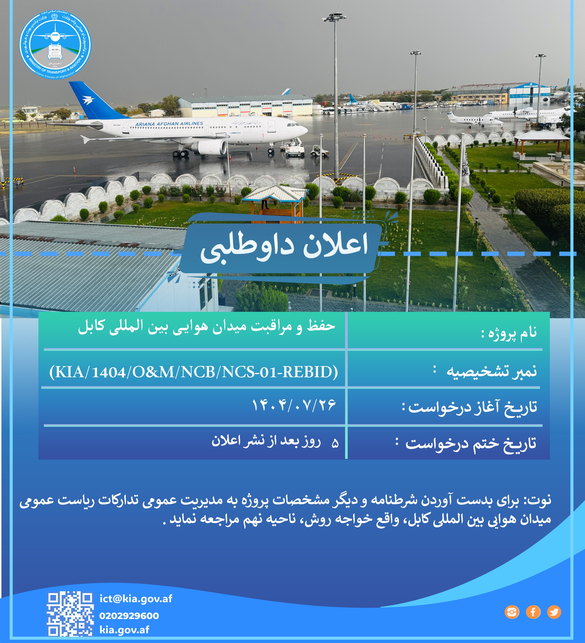 رياست عمومى ميدان هوایی بين المللى كابل از تمام داوطلبان واجد شرايط دعوت مى نمايد تا در پروسه داوطلب...